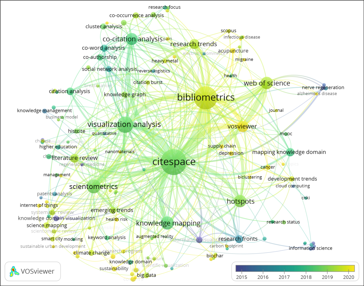 方法类 | bibliometrics(395)、visualization analysis(168)、scientometrics(118)、knowledge mapping(96)、co-citation analysis(78)、citation analysis(24)、co-word analysis(23)、co-authorship(17)、information visualization(17)、co-occurrence analysis(15)、social network analysis(15)、cluster analysis(14)、knowledge graph(14)、science mapping(14)、burst detection(12)、intellectual structure(11)、keyword analysis(8)、citation burst(7)、scientific visualization(6)、network analysis(5) |